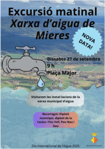 El mes de març passat, amb motiu del Dia Internacional de l’Aigua (22 de març), vam organitzar una sortida matinal per a conèixer com és la xarxa d’abastament d’aigua potable a Mieres i per veure les instal·lacions del nou pou que, finalment, no vam poder fer per la pluja. Ara, recuperem la proposta i el proper dissabte 27 de setembre, hem quedat a les 9 del matí a la Plaça Major per fer-la. Pujarem caminant al Dipòsit de distribució, que està al capdamunt de la Romeria, d’allà anirem al dipòsit de la Casica, on hi ha el pou vell; després, visitarem el nou pou, i per últim, i qui s’hi animi, ens aproparem fins a la deu.