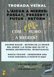 Amb la seva feina i partir de la memòria de l’aigua i de la seva actual gestió municipalitzada, l’Edurne ens proposa explorar nous models de participació ciutadana i de governança compartida en tots els àmbits. Una proposta que parteixi de les necessitats expressades i consensuades en una visió compartida per a decidir de quina manera i amb quines estructures podem aportar en la vida col·lectiva i comunitària. Què tenim, què ens falta i com ho fem. La sessió del dia 5, doncs, forma part d’aquest procés d’aprenentatge, imprescindible per dotar-nos d’eines que ens ajudin a actualitzar la participació i implicació dels veïns i veïnes de Mieres en la presa de decisions de tot el que afecta les nostres vides.