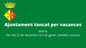 Com cada any, l’Ajuntament serà tancat per vacances des del dilluns 22 de desembre de 2025 fins al dimarts 6 de gener de 2026. Dimecres dia 7 de gener tornarà a ser obert en l’horari habitual.