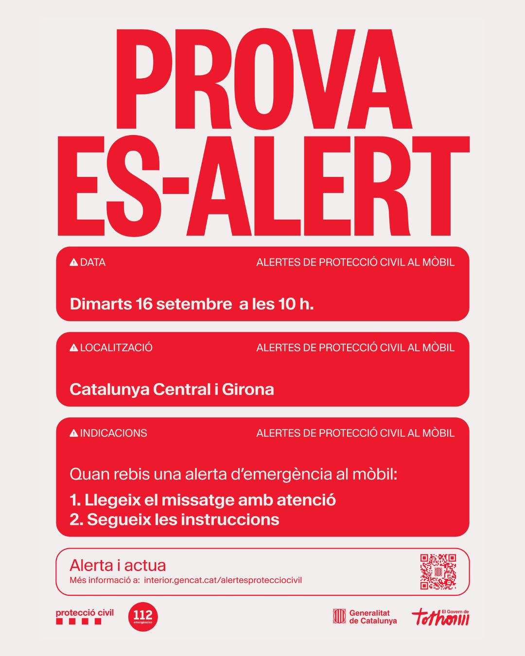 Protecció Civil de la Generalitat farà demà, 16 de setembre, la prova del sistema d’alertes als mòbils ES-Alert a la demarcació de Girona. L’activació es farà a les deu del matí i el missatge arribarà a tots els telèfons mòbils connectats a la xarxa en un interval d’uns quinze minuts. Com que serà una prova, no s’ha de […]