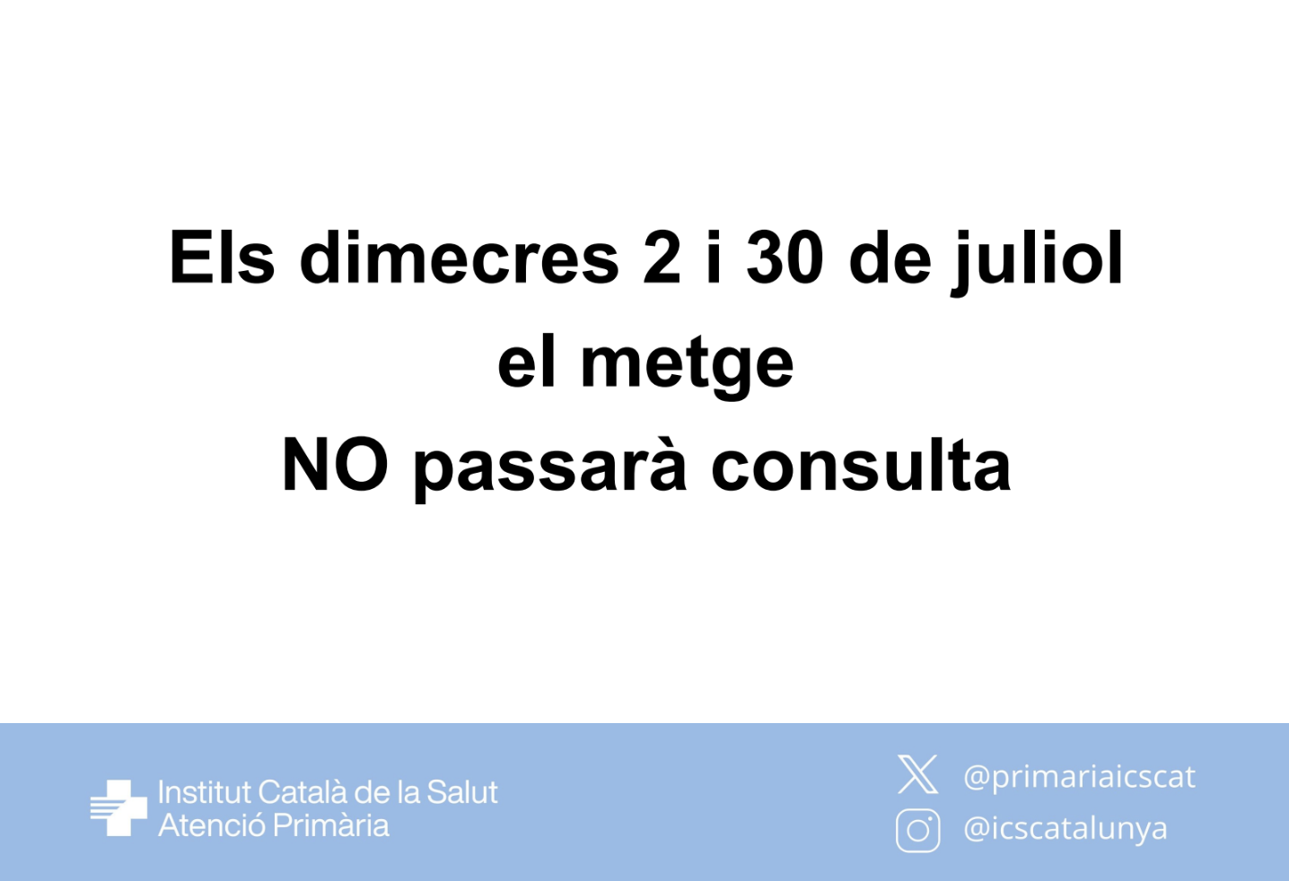 Els següents dies del mes de juliol no hi haurà consulta a Mieres: el metge, els dimecres 2 i 30 de juliol la infermera, el 22 de juliol Per qualsevol dubte o aclariment consulteu el CAP de Banyoles: Tel. 972572510