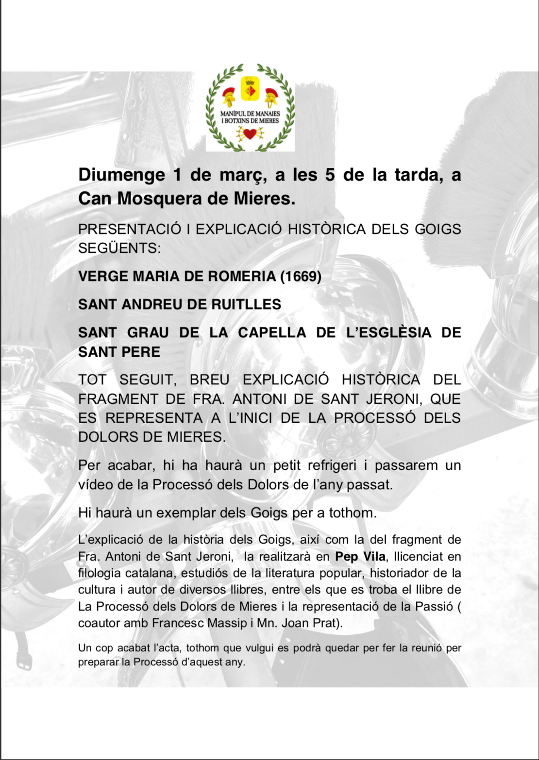 El proper diumenge 1 de març, a les 17 h es farà una xerrada a Can Mosquera, organitzada pel Manípul de Manaies i Botxins de Mieres. La xerrada, a càrrec de l’historiador i filòleg Pep Vila, consistirà en una explicació històrica dels diferents textos antics de goigs que s’han conservat a Mieres: Sant Andreu de Ruïtlles Sant […]