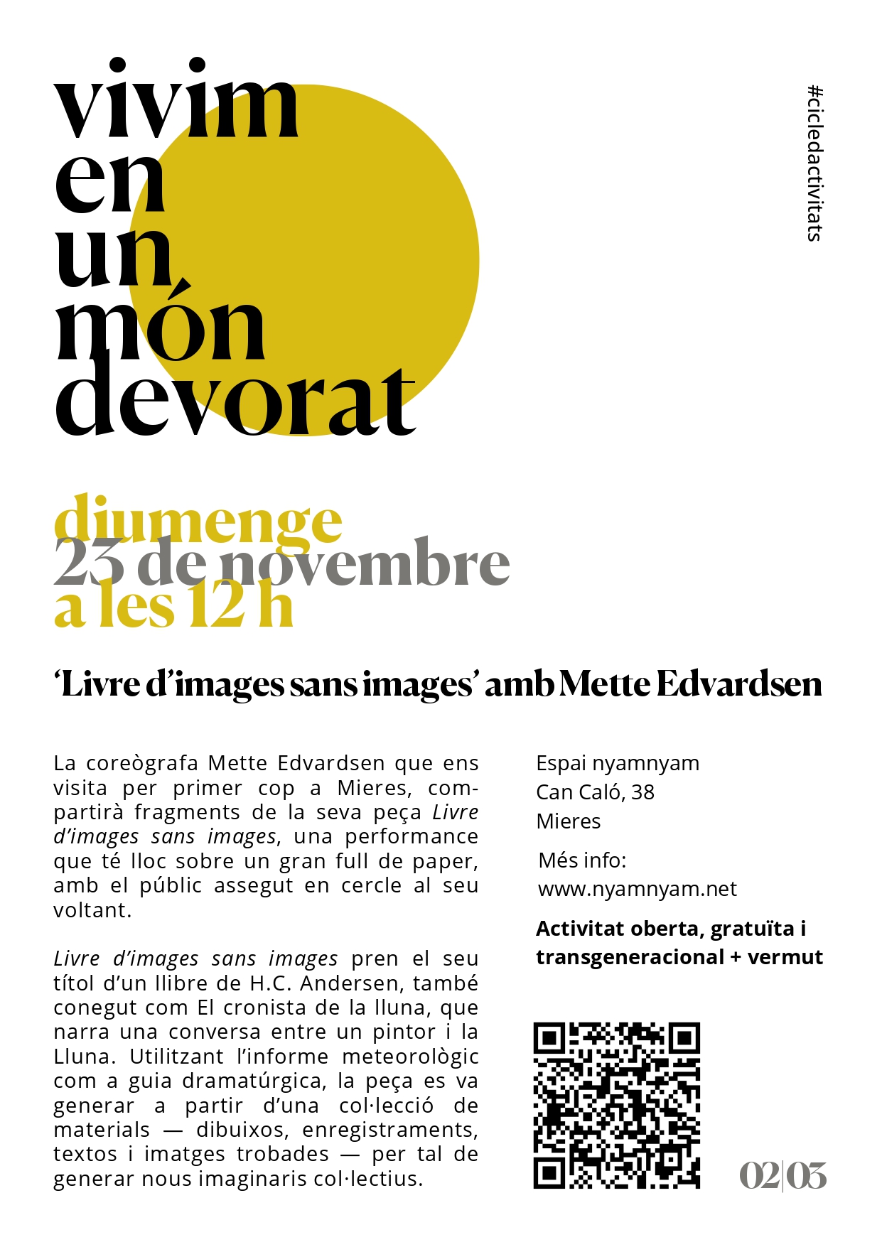 Aquest cap de setmana, torna el cicle de tardor-hivern ‘Vivim en un món devorat’ a l’Espai nyamnyam. Diumenge 23 de novembre a les 12h hi haurà obertura gratuïta i vermut. Aquesta activitat està dedicada a la peça ‘Llibre d’imatges sense imatges’ (Livre d’images sans images) de la coreògrafa Mette Edvardsen. Livre d’images sans images pren […]