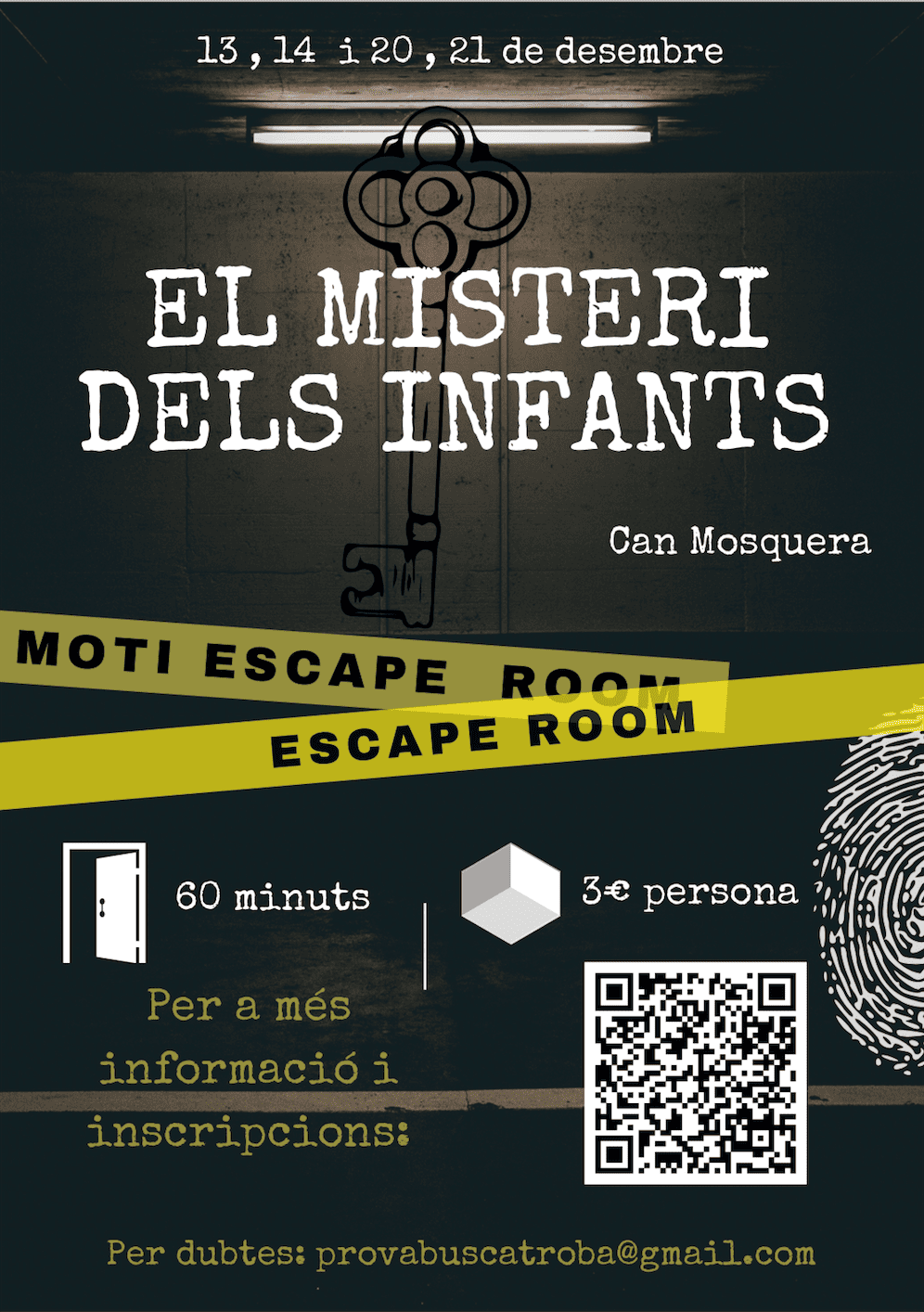 Tornem a tenir Escape Room a Mieres! De la mà de Moti Escape Room ens arriba un nou misteri! Els propers 13, 14, 20 i 21 de desembre seran caps de setmana monogràfics a Can Mosquera per a qui es vulgui animar a resoldre’l… Teniu tota la informació al cartell adjunt. Quina emoció!