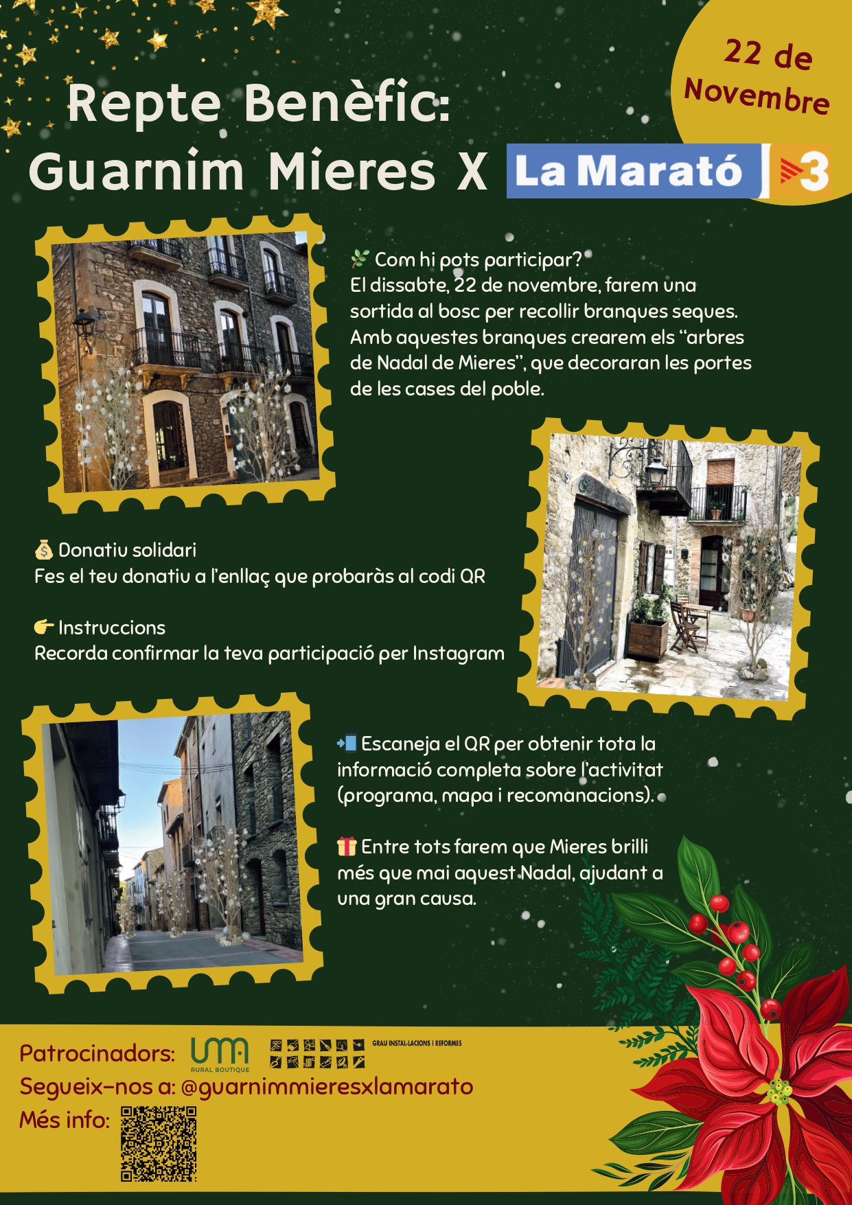 El proper dissabte 22 de novembre, una iniciativa veïnal ens convida a sortir al bosc per recollir branques i fer-ne “arbres de Nadal” per guarnir els carrers del poble. Aquesta activitat s’emmarca en una campanya de donatius per La Marató de TV3 d’enguany. Al cartell adjunt hi trobareu la informació i el codi QR amb […]