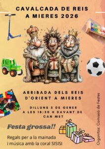 Els Reis d’Orient arriben, un any més, a Mieres. La Comissió de Festes, amatent, organitza una cavalcada per a rebre’ls, acollir-los i acompanyar-los en una passejada pel poble.
