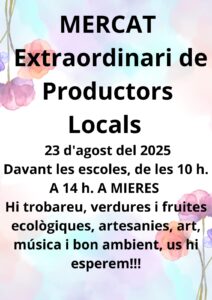 Com cada any, en el marc de la Festa Major, se celebrarà, el dissabte 23, el mercat extraordinari de Festa Major. Com sempre, el mercat estarà a la zona de l’escola i el dispensari. Entre les parades de fruita i verdura i art i artesania locals, també hi haurà música per gaudir i passar-hi l’estona tot fent un cop d’ull.