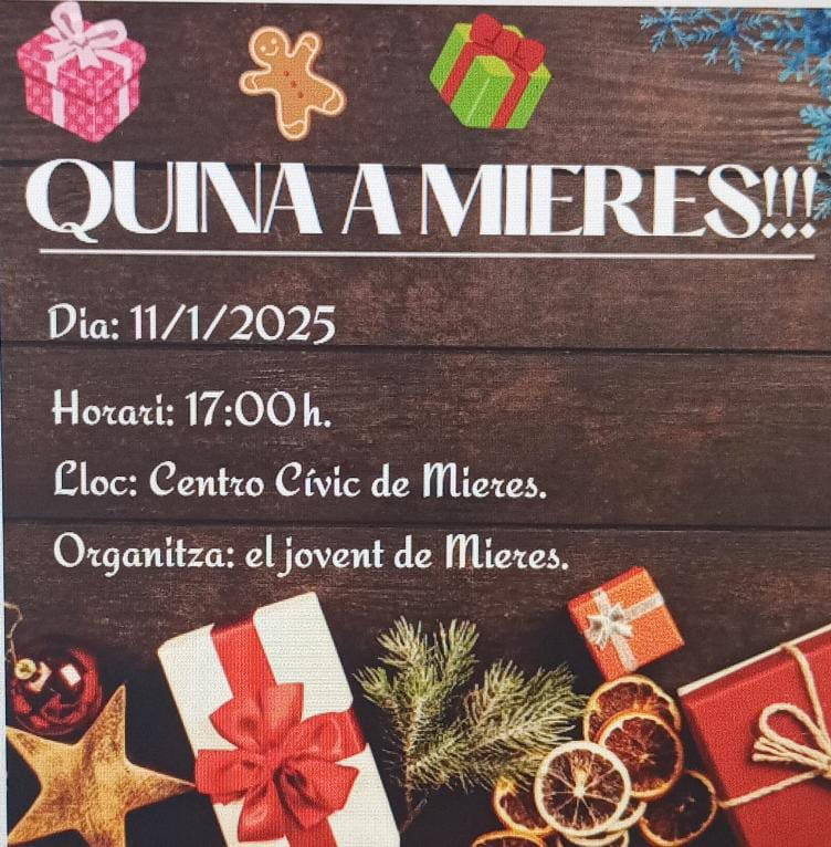 El grup de joves de Mieres conviden a tot el veïunat de Mieres a la Quina al Cívic, el proper dia 11 de gener. Animeu-vos a venir i participar, les joves han estat treballant de valent per a poder tenir molts premis per aquest gran dia. La diversió està assegurada, a més també hi haurà un servei de bar durant la Quina. Tots els diners aniran íntegrament destinats a les activitats pel grup de joves. Ens veiem el dissabte 11!