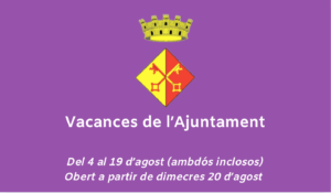 Us informem que a partir de dilluns 4 d’agost, l’atenció al públic a l’Ajuntament restarà tancada fins el dia 19 d’agost, per vacances. Tornarà a obrir el dimecres 20 d’agost.